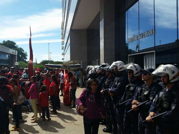 O protesto aconteceu em frente ao anexo do ministério, no início da Asa Sul. Policiais militares fizeram um cordão de isolamento em frente à fachada do prédio.