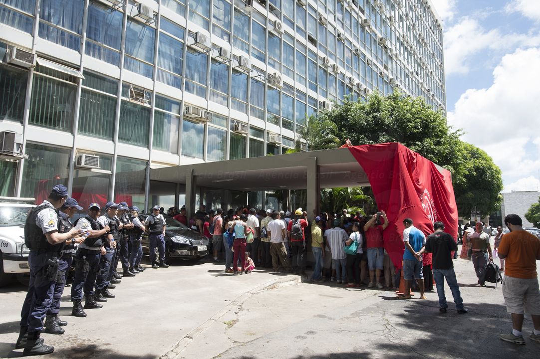 Trezentos manifestantes ligados ao Movimento dos Trabalhadores Sem Teto (MTST) bloqueiam desde as primeiras horas da manhã desta quarta-feira 11 a entrada de serviço do Ministério da Fazenda. Eles chegaram de ônibus de áreas do Entorno do Distrito Federal. A entrada privativa do ministro está guarnecida por soldados da Polícia Militar.