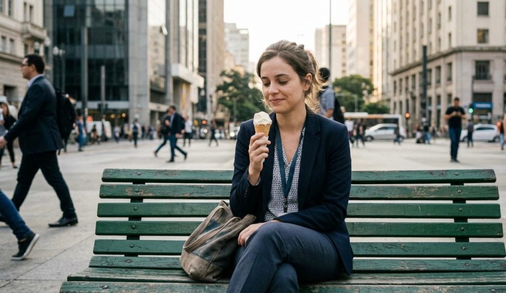 Tomar um sorvete no meio do dia, sozinho, pode ser um pequeno gesto de autonomia. Um intervalo na lógica produtiva. Um momento em que o corpo não precisa produzir, apenas estar.
