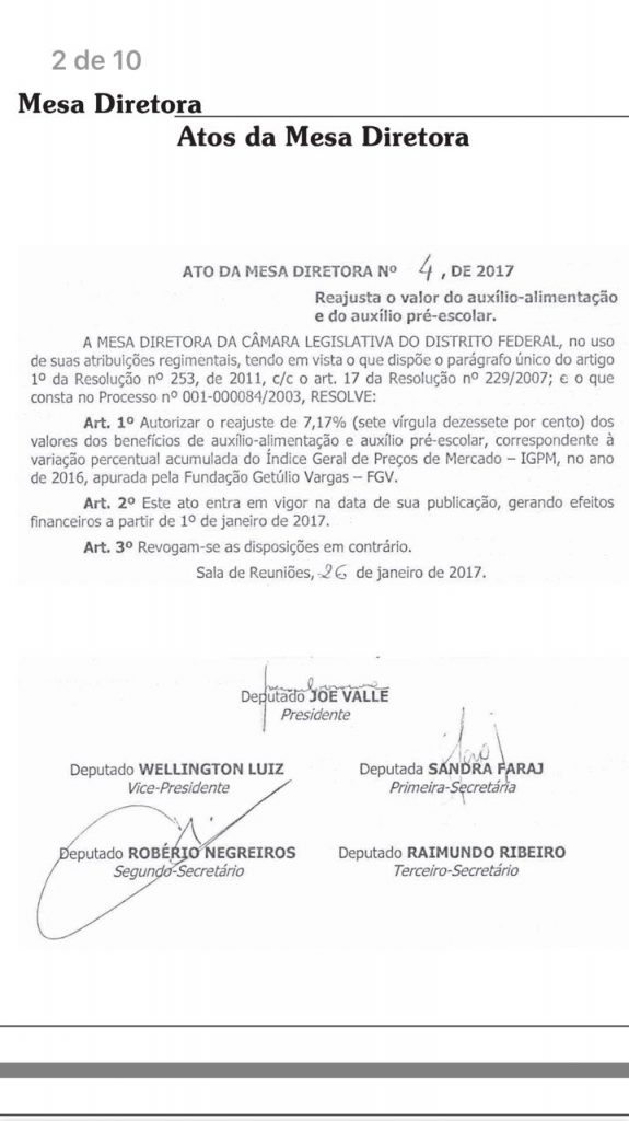 E enquanto o Palácio do Buriti congela os benefícios, a Câmara Legislativa, reconhecendo os méritos do seus servidores, acaba de conceder um reajuste de 7% para a categoria. O índice acompanha a inflação oficial, e abrange o vale-refeição e o auxílio-escola.