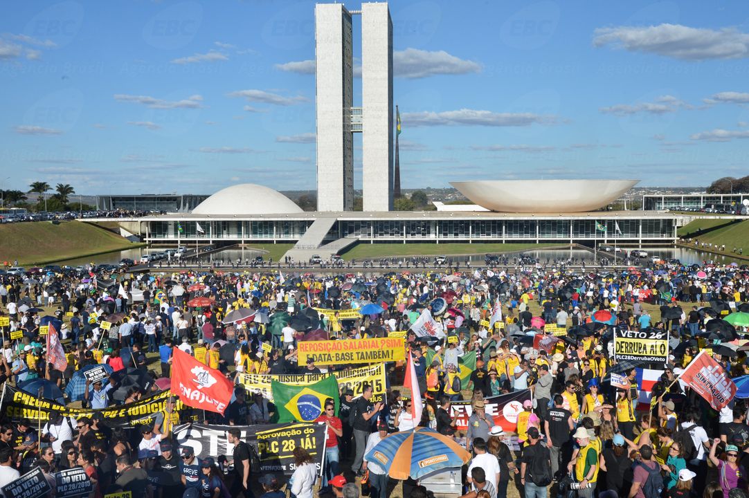 Contrários ao veto da presidenta Dilma Rousseff ao projeto de lei que reajusta os salários dos servidores do Poder Judiciário em até 78,56%, os trabalhadores do Judiciário ocuparam o espelho d’água em frente ao Congresso Nacional, pedindo a derrubada do veto.