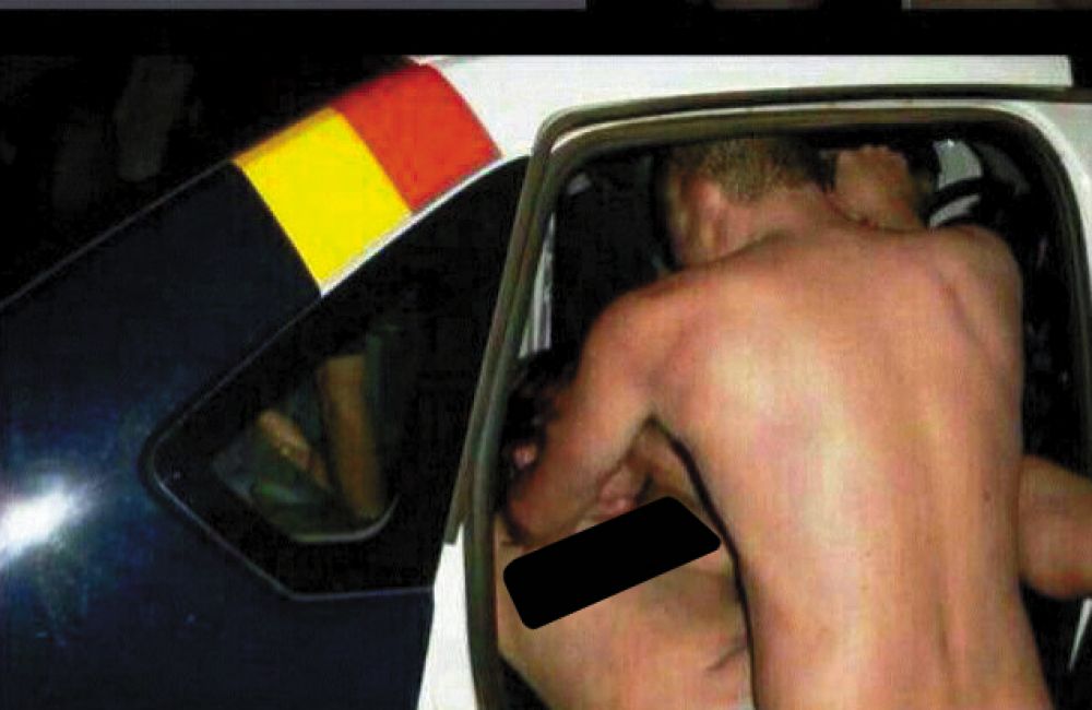 Com o aparente cuidado de não mostrar rostos nem o prefixo da viatura, os homens são fotografados de costas. A única mulher do grupo está deitada e sem sutiã. São pelo menos quatro imagens. A primeira mostra um suposto policial militar com a mulher no banco de trás do veículo.