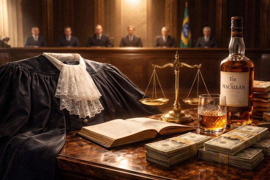 Alguns sinais desse ambiente aparecem de forma quase simbólica. Quando a discrição esperada da toga passa a conviver com encontros sofisticados e degustações de rótulos escoceses de prestígio internacional, o problema não está no whisky. O problema é o contraste.