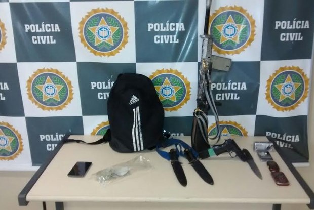 Na residência do acusado, os agentes encontraram uma réplica de fuzil e outra de pistola, além de três facas profissionais e uma mochila onde estavam objetos roubados de diversas vítimas, inclusive a desta quarta-feira.