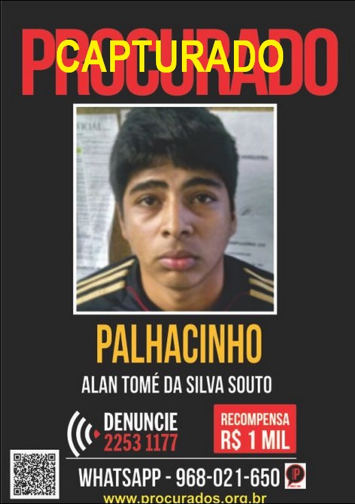 O traficante Alan Tomé da Silva Souto, de 20 anos, conhecido pelo apelido de Palhacinho, e apontado como um dos executores de Francisco Testas Monteiro, o Tuchinha, foi preso nesta quarta-feira (1) em Nova Iguaçu, na Baixada Fluminense. Segundo o G1,  a prisão ocorreu no mesmo dia em que o Portal dos Procurados anunciou que a recompensa por informações que levassem à prisão dele subiu de R$ 1 mil para R$ 5 mil.