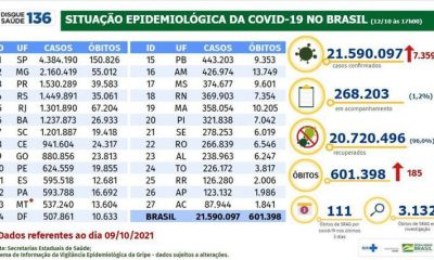 O Brasil chegou a 601.398 mortes por covid-19 nesta terça (12). Em 24 horas, foram 185 óbitos e 7.359 novos casos. No total, 21.590.097 casos já...