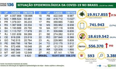 O total de vidas perdidas para a covid-19 no Brasil subiu para 556.370, segundo boletim divulgado pelo Ministério da Saúde neste sábado, 31. Em 24 horas,...