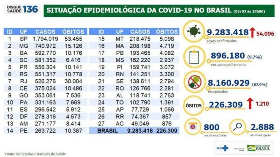 O número de pessoas que não resistiram à Covid-19 no Brasil e morreram subiu para 226.309. Em 24 horas, foram registradas 1.210 mortes. Há ainda 2.888...