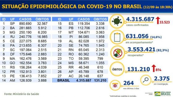 O balanço divulgado neste sábado (12) pelo Ministério da Saúde mostra 814 mortes por covid-19 nas últimas 24 horas, totalizando 131.210 óbitos desde o começo da...