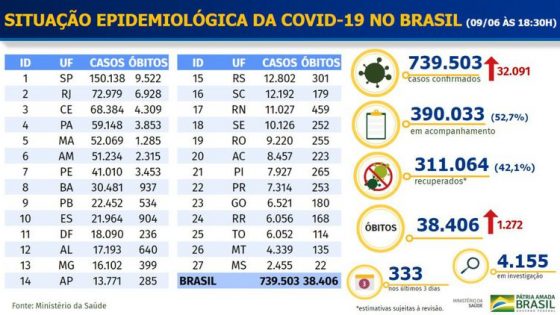 O Brasil registrou mais 1.274 mortes pelo novo coronavírus (Sars-CoV-2) nas últimas 24 horas, elevando o número total para 39.680; Os números são do balanço oficial...