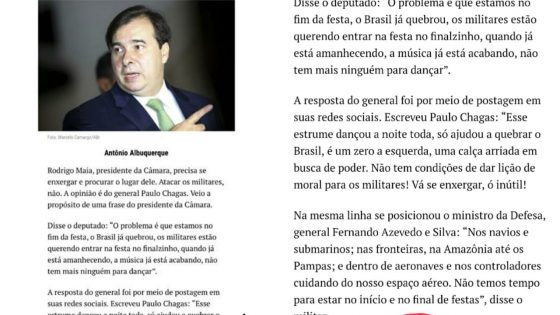 Rodrigo Maia, presidente da Câmara, precisa se enxergar e procurar o lugar dele. Atacar os militares, não. A opinião é do general Paulo Chagas. Veio a...