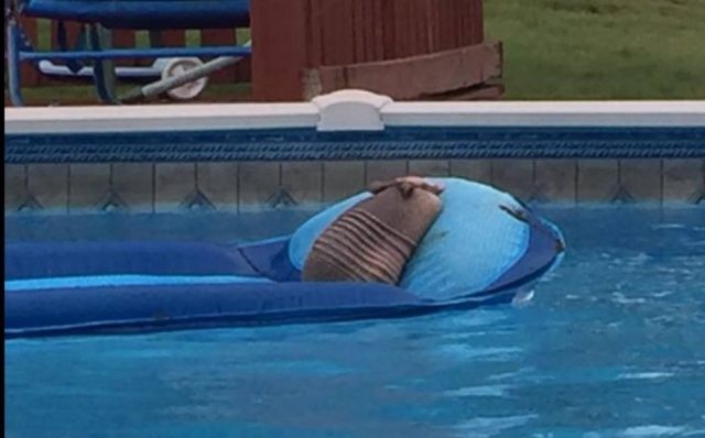 O americano Kristy West vive no Texas, mas tirou férias e viajou com sua família. Um tatu que vive na vizinhança aproveitou que a casa estava vazia e decidiu usar a piscina. Entretanto, ele não passou despercebido: West havia pedido para sua cunhada dar uma olhada na casa durante a viagem, e foi aí que ela flagrou o animal.