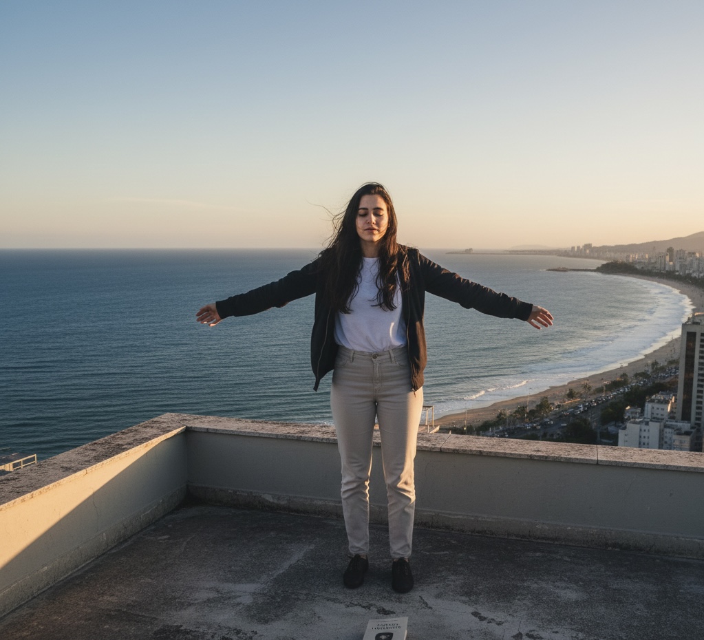 Ela preferiu subir até o terraço do prédio pelas escadas. A última porta corta-fogo bateu e isso a fez tremer por alguns instantes. Na sua mão direita, um livro que estava relendo. Era um clássico da literatura mundial. – “Os clássicos são os meus melhores amigos.” – dizia ela – “Eles sempre me dizem o que preciso ouvir outra vez”.