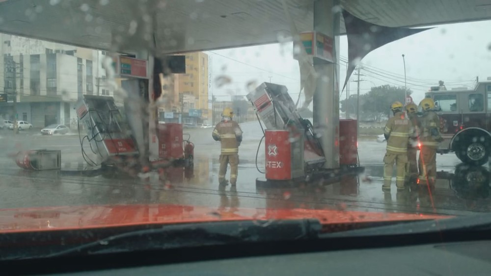 Segundo a Defesa Civil, na avenida Samdu Norte, até bombas de gasolina de um posto desativado foram ao chão. Na Praça do Bicalho, uma árvore tombou.