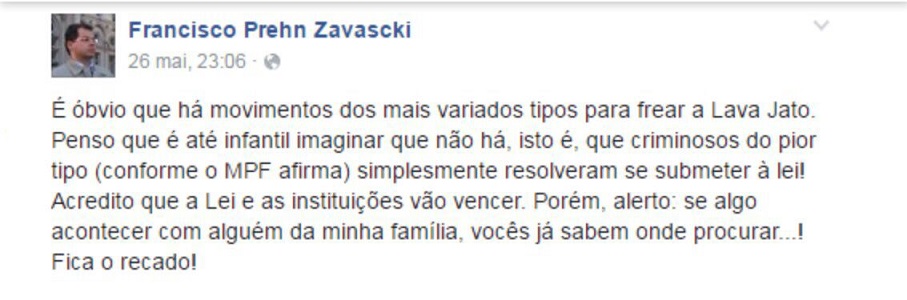 Leia o que o filho do ministro do Supremo escreveu em 26 de maio, ele escreveu: “É obvio que há movimentos dos mais variados tipos para frear a Lava Jato. Penso que é até infantil imaginar que não há, isto é, que criminosos do pior tipo (conforme o MPF afirma) simplesmente resolveram se submeter à lei! Acredito que a lei e as instituições vão vencer. Porém, alerto: se algo acontecer com alguém da minha família, vocês já sabem onde procurar…! Fica o recado!”.