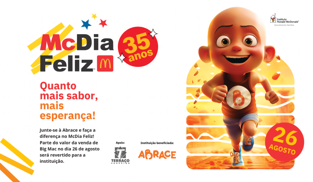 No próximo sábado, 25, acontecerá a 35ª edição do McDia Feliz, uma das principais campanhas do país em arrecadação de fundos para causas infantojuvenis. Toda a renda gerada com as vendas de sanduíches Big Mac, exceto alguns impostos, será revertida para a Abrace (Associação Brasileira de Assistência às Famílias de Crianças Portadoras de Câncer e Hemopatias), que atua em Brasília para promover saúde e bem-estar para crianças, adolescentes e seus familiares.