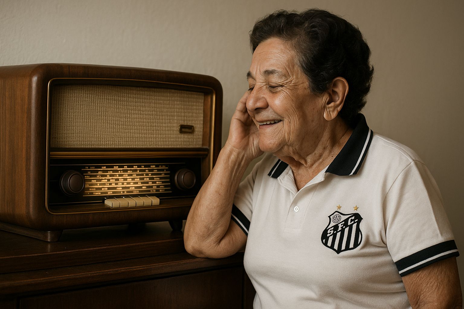 Na sala de casa havia uma cristaleira e, sobre ela, uma rádio vitrola. Não tínhamos TV, mas, mesmo se tivéssemos, os jogos não eram televisionados, apenas transmitidos pelas rádios, e, diga-se, o som que chegava era de péssima qualidade. Assim, para se conseguir ouvir alguma coisa, era necessário se aproximar bem do aparelho. O móvel não era muito alto, mas tia Rita, com menos de 1,50 m de altura, tinha dificuldade em alcançar, obrigando-a a ficar nas pontas dos pés para colar ouvido. Ǫuando o Brasil marcava um gol, ela comemorava empolgada, mas se fosse de Pelé, a comemoração era muito mais efusiva e ela gritava o nome dele. Estas cenas, até hoje, permanecem gravadas em minha retina, e embora seja uma lembrança feliz, eu não compreendia muito bem o que se passava.