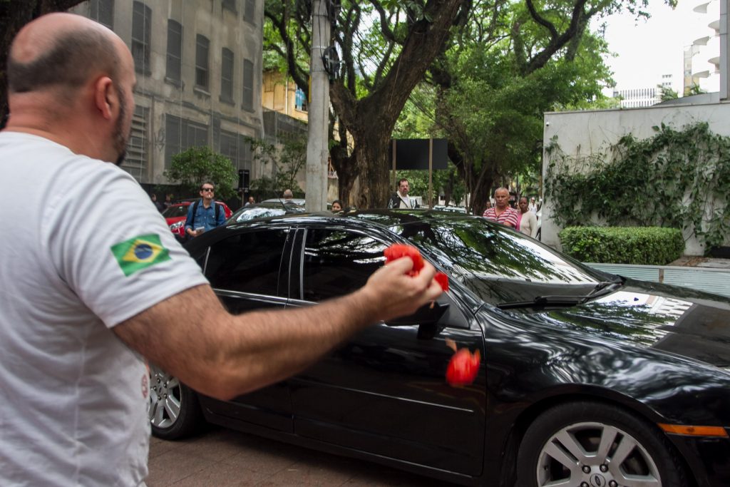Na verdade, o carro não era nem de Mendes nem de Moraes. Além dos tomates eles carregavam um megafone no qual xingavam Mendes com palavras como “pilantra” e “desonesto” e citavam manifestações de militares, entre eles o general Hamilton Mourão, sobre a atuação do ministro do STF. Uma delas usava uma camiseta com um desenho da presidente cassada Dilma Rousseff e a palavra “Pinóquia”.