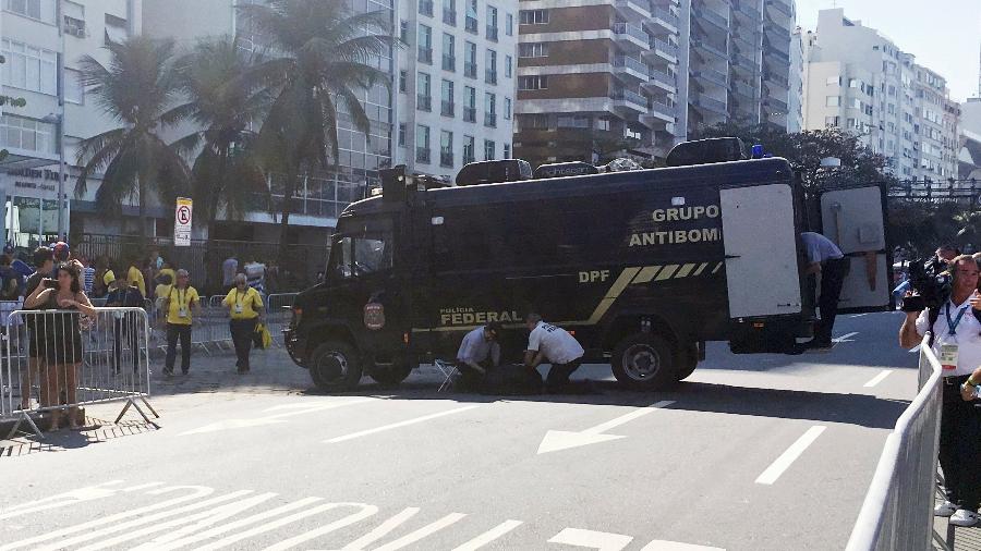 Ainda no sábado, houve ocorrências na avenida Primeiro de Março, no centro, onde o prédio do Centro Cultural dos Correios chegou a ser evacuado, e em Copacabana, na zona sul. Este último caso, que ocorreu perto da praia de Copacabana, exigiu que os especialistas da PF detonassem uma mochila abandonada.