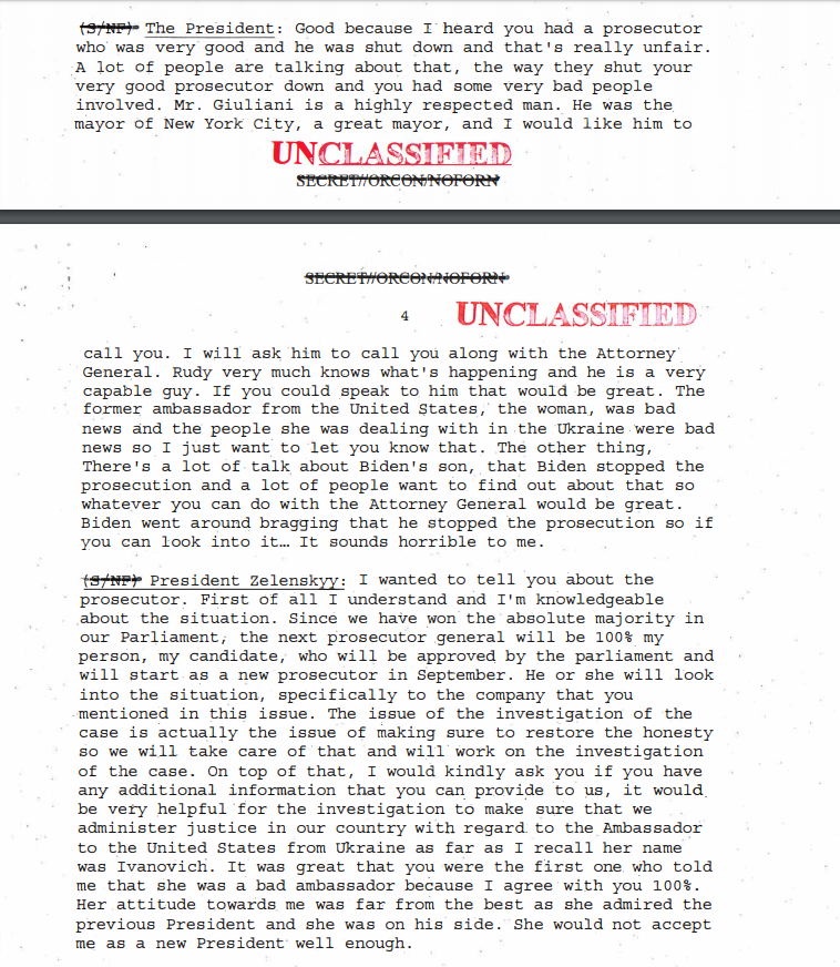 O Comitê de Inteligência da Câmara dos Representantes (equivalente à Câmara dos Deputados no Brasil) dos Estados Unidos divulgou nesta quinta, 26,  uma versão redigida da denúncia contra o presidente Donald Trump por suposto abuso de poder. As acusações surgiram após uma conversa por telefone com o presidente ucraniano Volodymyr Zelensky. A acusação motivou um pedido de impeachment de Trump.