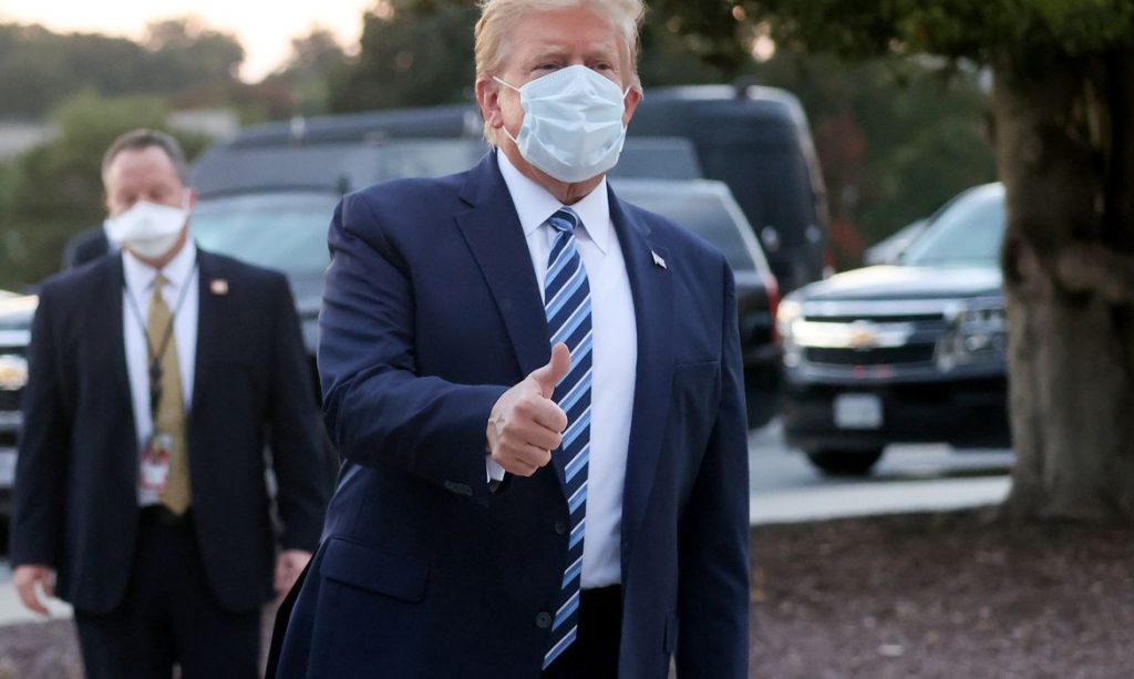 Usando o que parecia ser uma máscara cirúrgica branca, Trump bateu com o punho no ar e fez um sinal de positivo ao descer os degraus do Centro Médico Walter Reed, nas imediações de Washington, respondendo uma pergunta sobre quantas pessoas estavam infectadas na Casa Branca dizendo: “Muito obrigado.”