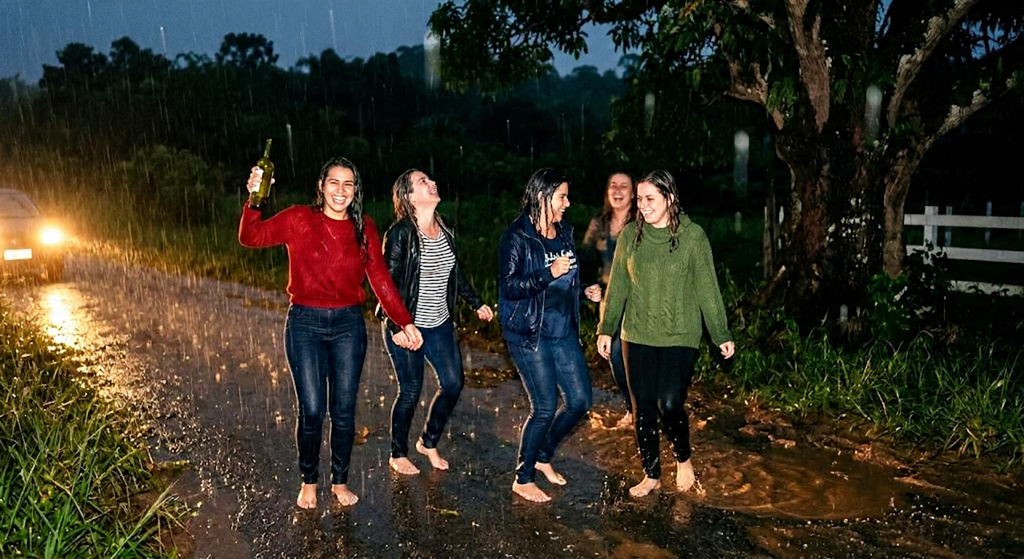 Luciana encosta o carro atrás de uma grande árvore, descemos todas, pegamos uma garrafa de vinho e fomos dançar na chuva, ri, relembrar da infância, em pouco tempo o que era estressante deu um lugar a um miomento especial.