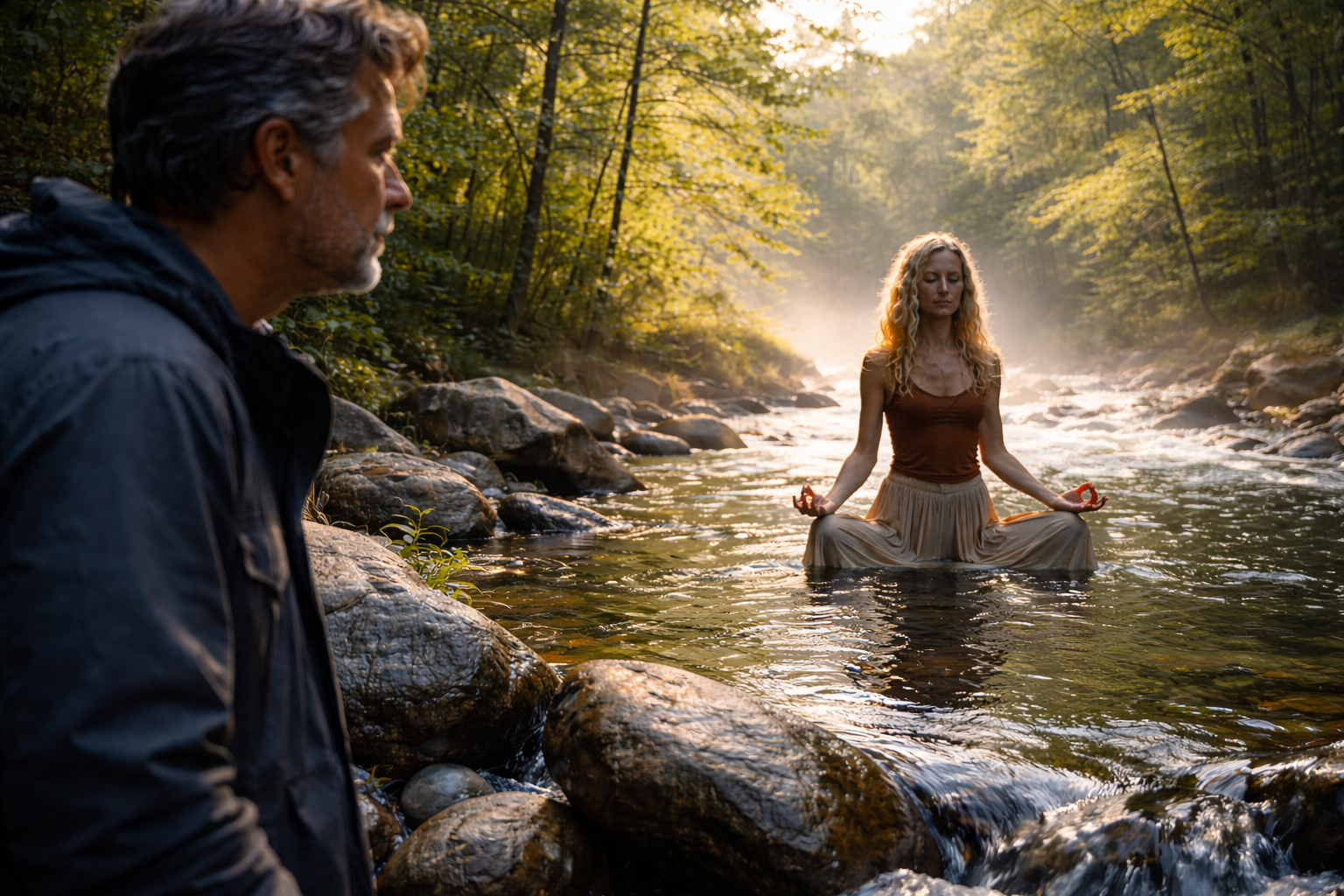Ela entrou no riacho de águas cristalinas, que desciam de uma montanha verde com estrépito. Ficou ali até a cintura, colocou-se numa posição incomum com as mãos e entoou uma espécie de cântico. Ele observava, entre atônito e curioso, e rememorava como haviam chegado até ali.