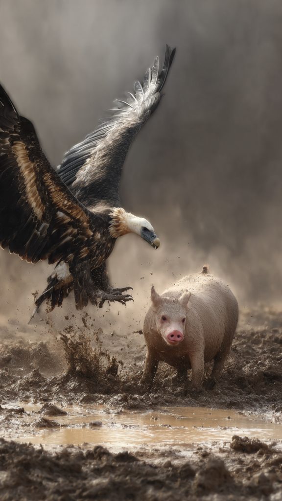O urubu vinha crocitando alegremente, cuá cuá [tá ok, sei que quem crocita é o corvo, mas guglei, moçada, dá pra dizer que urubus crocitam maviosamente], e viu um porco sorridente, oinc oinc, espojando-se na lama, na lama, na lama.