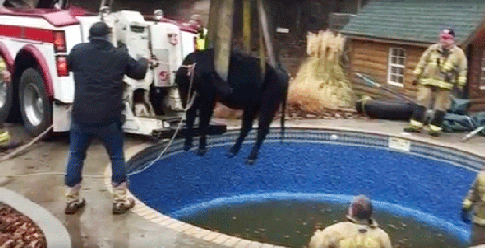 Benny Fulkerson, chefe do batalhão, disse que os bombeiros bombearam água para fora da piscina, e depois içaram o animal, que pesava quase 700 kg.