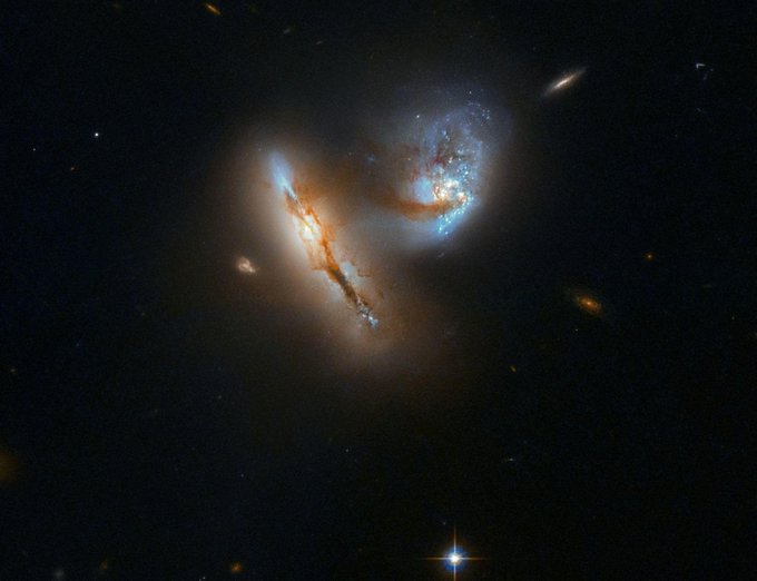 O telescópio espacial Hubble conseguiu registrar uma imagem impressionante: a rota de colisão entre duas galáxias. A imagem foi divulgada pela Nasa.