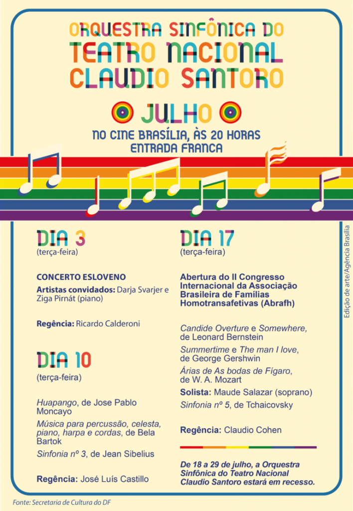 A diversidade vai ser celebrada em julho pela Orquestra Sinfônica do Teatro Nacional Claudio Santoro. A programação contempla artistas alinhados com a defesa das variadas formas de amor, independentemente da orientação sexual ou da identidade de gênero. Nesse contexto, serão executadas peças como The man I love, do americano George Gershwin.
