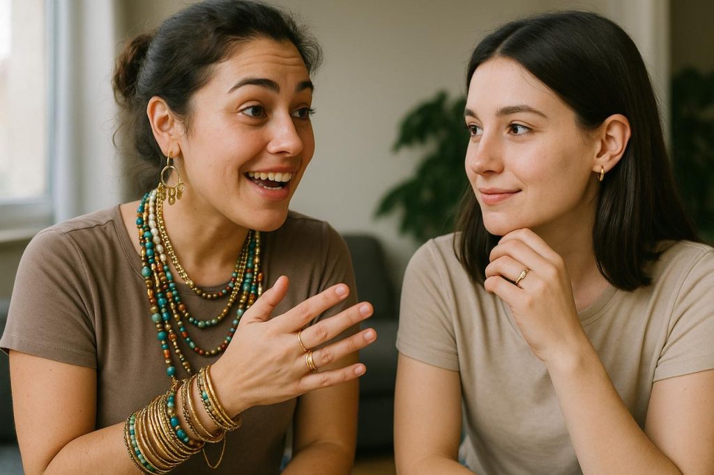 Já a minha irmã… bom, minha irmã é o extremo oposto. Como boa leonina, ela marca território e presença com suas peças grandes, muitas vezes extravagantes. Usa anéis como se tivesse dez mãos, pulseiras que soam como sinos, colares que poderiam contar histórias inteiras.