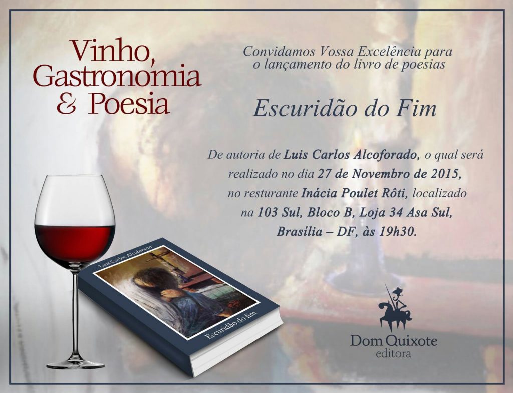 A noite desta sexta-feira, 27, será regada a vinho, gastronomia e poesia. Tudo em volta do advogado Luis Carlos Alcoforado, que lança a parir das 19 horas, no Inácia Poulet Rôti, na 103 Sul, seu livro de poemas Escuridão do Fim. A obra, que vem com o selo da Dom Quixote, vai se somar a outros grandes trabalhos literários de Alcoforado, que arranja tempo, entre um e outro processo, para mostrar que jurista também é sensível.