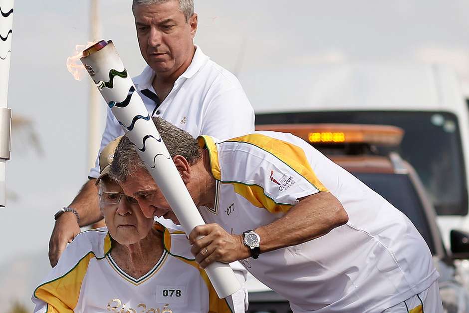 Durante o revezamento da tocha olímpica na cidade do Rio de Janeiro na manhã desta quinta-feira, uma imagem foi bastante comovente. O tetracampeão mundial Zagallo recebeu o símbolo olímpico de Carlos Alberto Parreira e carregou a tocha em uma cadeira de rodas.