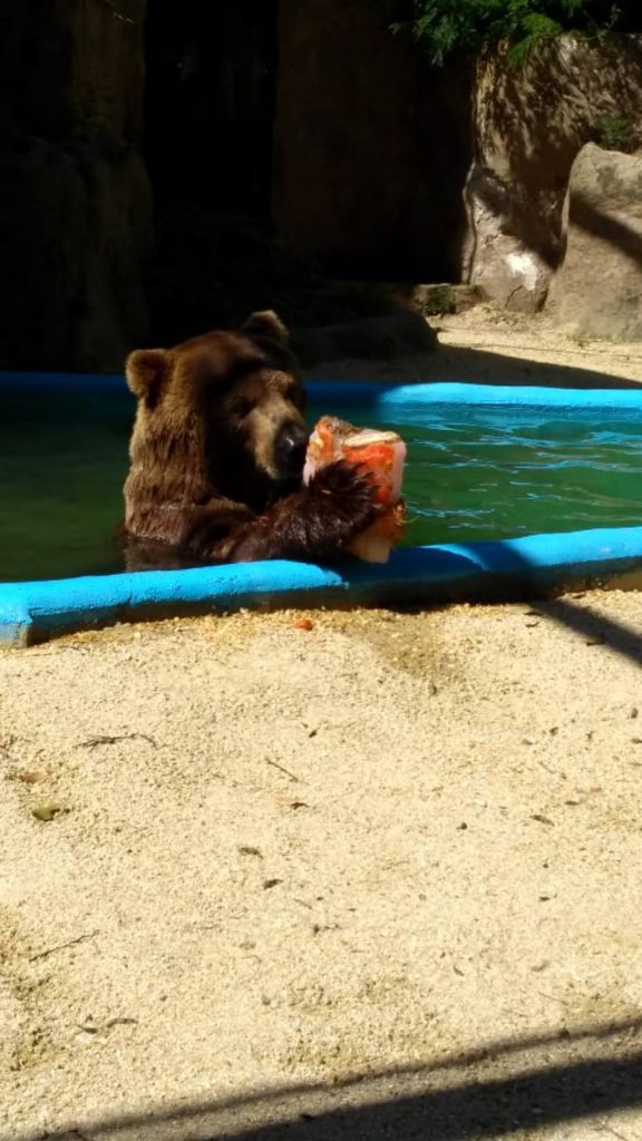 Na tarde de terça-feira, 8, o urso pardo Zé Colmeia chamava atenção dos visitantes com um enorme picolé de frutas. Os picolés são feitos com frutas que já fazem parte da dieta normal do animal, mas são oferecidos nesse formato nos dias em que as temperaturas estão especialmente altas.